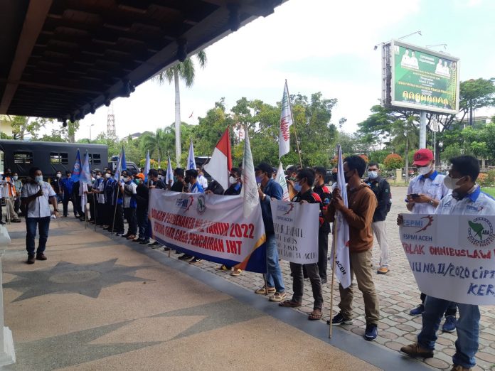 Mereka menyuarakan desakan terhadap Permen Naker tersebut di depan Gedung DPR Aceh, Rabu (23/2/2022).