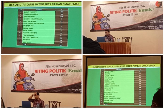 Sementara itu menurut data hasil survey SSC, untuk kategori elektabilitas capres dan cawapres pilihan emak-emak, nama Gubernur Jawa Tengah, Ganjar Pranowo memuncaki urutan pertama dengan 16,3% emak-emak Jatim yang memilihnya untuk menjadi calon presiden RI pada periode mendatang. Pada urutan kedua nama Prabowo Subianto juga menghiasi pilihan emak-emak di Jatim dengana perolehan sebanyak 15.6% suara.