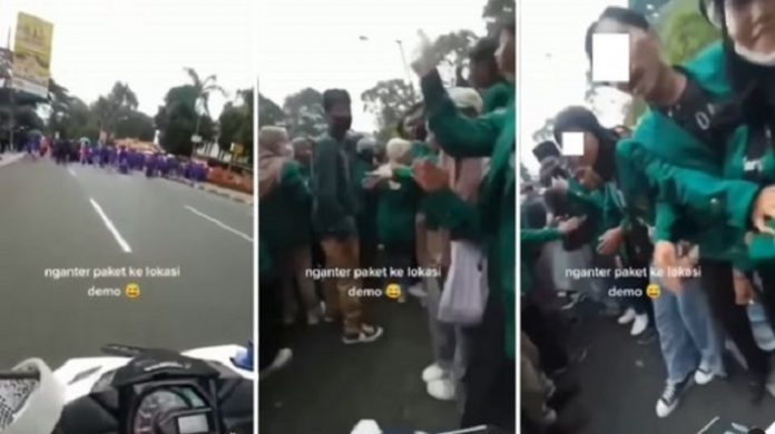 JAKARTA, Nawacita – Beredar video viral aksi seorang kurir yang terpaksa mengantar paket di saat yang tidak tepat. Kurir dengan motor Honda Beat ini terpaksa mengantar sebuah paket di saat aksi demo mahasiswa berlangsung.