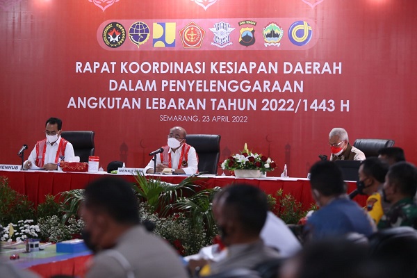 Untuk mengecek kesiapan Provinsi Jawa Tengah dalam menghadapi arus mudik lebaran, Menteri Koordinator Bidang Pembangunan Manusia dan Kebudayaan (Menko PMK) Muhadjir Effendy bersama Menteri Perhubungan Budi Karya Sumadi melakukan Rapat Koordinasi Kesiapan Dalam Penyelenggaraan Angkutan Lebaran Tahun 2022, di Kantor Pusat Jasa Marga Gerbang Tol Kalikangkung Semarang, pada Sabtu (23/4).