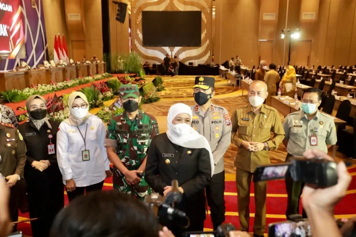 Kota Malang, Nawacita | Menjelang Hari Raya Iduladha, Khofifah Indar Parawansa Gubernur Jawa Timur bersama jajaran Forkopimda Jatim kembali menggelar rapat kpordinasi (rakor) percepatan penanggulangan Penyakit Mulut dan Kuku (PMK) pada hewan ternak di Ballroom Hotel Grand Mercure Kota Malang, Senin (30/5/2022).