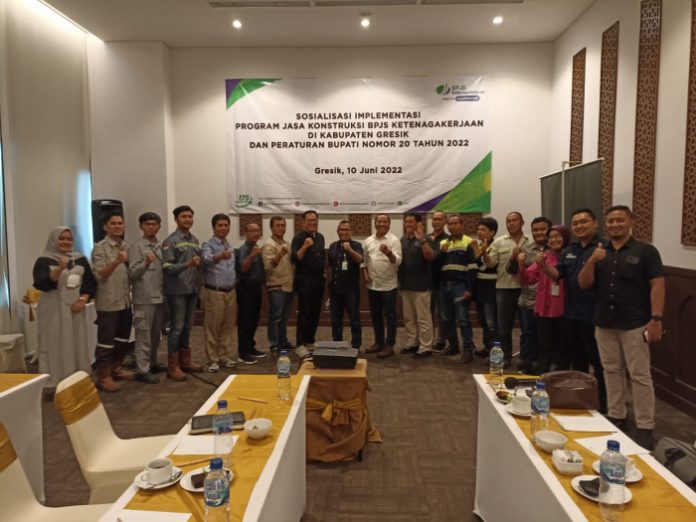 Gresik, Nawacita – 10 Juni 2022, sebagai upaya melaksanakan amanah negara dalam mencapai welfare state, BPJS Ketenagakerjaan Cabang Gresik melaksanakan Sosialisasi Implementasi Program Jasa Konstruksi dan Sosialisasi Peraturan Bupati Gresik No 20 Tahun 2022.