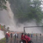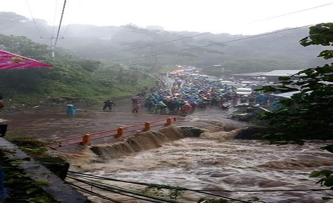 Air Terjun Lembah Anai meluap hingga meluber ke badan jalan sehingga membuat kemacetan panjang.