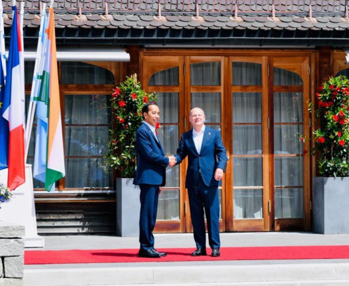 Jerman | Nawacita – Presiden Joko Widodo tiba di lokasi KTT G7 di Schloss Elmau, Jerman, disambut oleh Kanselir Jerman Olaf Scholz, Senin siang, 27 Juni 2022. Dalam sesi penyambutan resmi oleh Kanselir Jerman tersebut, Presiden hadir bersama pemimpin dari negara mitra G7 yaitu Presiden Argentina Alberto Fernández, Perdana Menteri India Narendra Modi, Presiden Senegal Macky Sall, dan Presiden Afrika Selatan Cyril Ramaphosa.