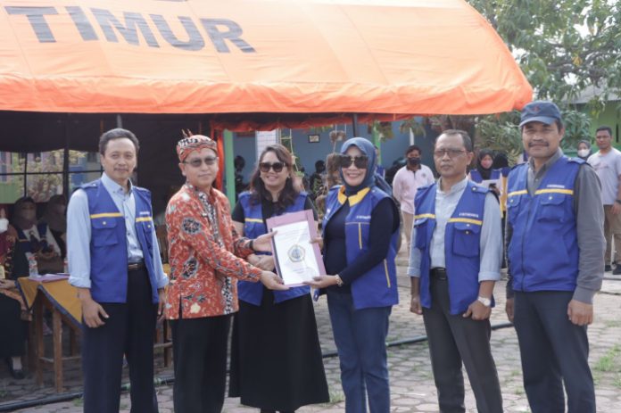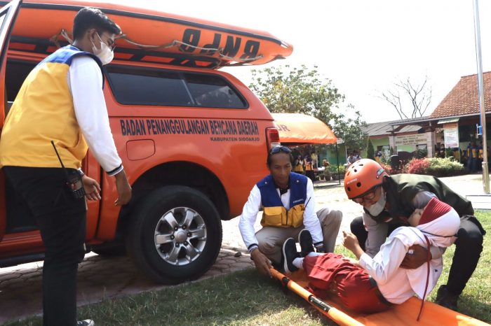 Sidoarjo | Nawacita – Selasa (05/06), bertempat di halaman SDN Terung Wetan Kecamatan Krian Kabupaten Sidoarjo, sekitar 50 mahasiswa perwakilan dari 5 kelompok peserta Kuliah Kerja Nyata (KKN) Tematik Semester Genap Tahun Akademik (T.A.) 2021/2022 Universitas Dr. Soetomo (Unitomo) dikunjungi rombongan Rektorat dan Kepala Badan Penanggulangan Bencana Daerah (BPBD) Kabupaten Sidoarjo, Dwijod Prawito.