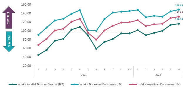 Kepala Perwakilan Bank Indonesia Provinsi Jawa Timur, Budi Hanoto menyampaikan, Peningkatan keyakinan konsumen didorong persepsi konsumen terhadap kondisi ekonomi saat ini dan ekspektasi kondisi ekonomi ke depan yang membaik. Indeks Kondisi Ekonomi (IKE) saat İni yang mencerminkan persepsi konsumen terhadap kinerja perekonomian saat ini meningkat dan tetap berada pada level optimis, yakni sebesar 1 16,79 pada Juni 20221 lebih tinggi dari 1 14,13 pada Mei 2022.
