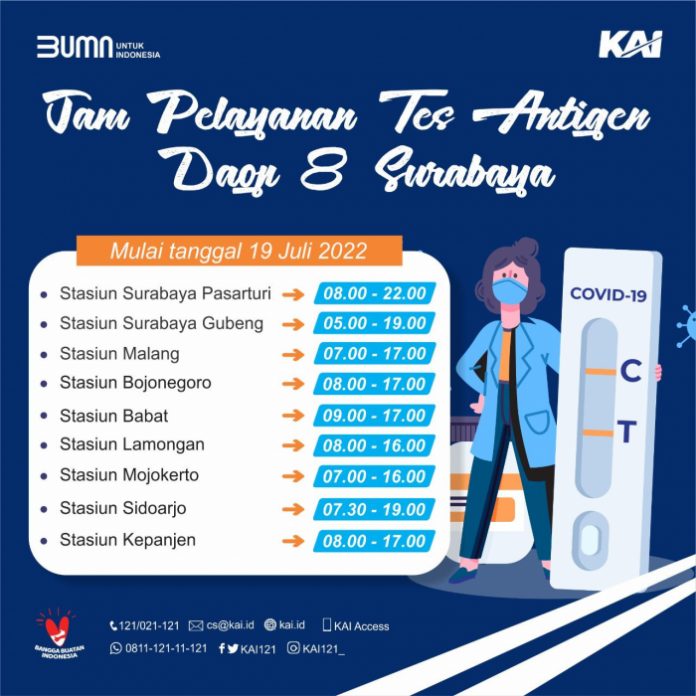 Bagi pelanggan yang masih vaksin dosis kedua, KAI Daop 8 Surabaya juga menyediakan layanan pemeriksaan antigen di 9 stasiun, yaitu :