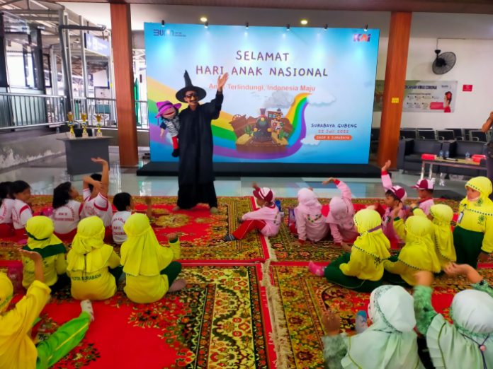 Surabaya | Nawacita – Dalam rangka menyambut Peringatan Hari Anak Nasional (HAN) yang diperingati tiap tanggal 23 Juli, PT Kereta Api Indonesia (Persero) Daop 8 Surabaya menggelar lomba mewarnai tingkat TK dan mendengarkan dongeng edukasi mengenai transportasi Kereta Api yang sehat dengan menghadirkan Pegiat Dongeng dari Surabaya, Harris Rizky.