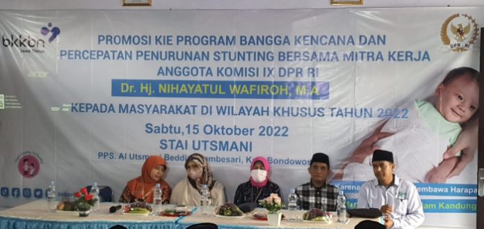 Bondowoso, Nawacita – Percepatan penurunan stunting menjadi masalah Bersama dan tanggungjawab Bersama untuk menyelesaikannya. Sinergi berbagai sektor diperlukan, salah satunya sinergi BKKBN Provinsi Jawa Timur dengan komisi IX DPR RI untuk melakukan edukasi kepada masyarakat terkait percepatan penurunan stunting. Salah satunya yang dilaksanakan melalui Promosi dan KIE Program Bangga Kencana dan Percepatan Penurunan Stunting di STAI Al Ustmani, Bondowoso, Sabtu 15 Oktober 2022.