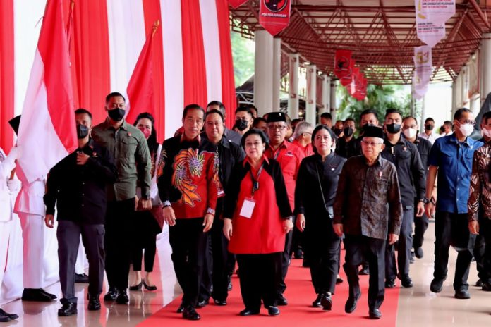 Ketua Umum PDI Perjuangan Megawati Soekarnoputri ikut menyaksikan dan duduk bersama di tengah panggung berdampingan dengan Presiden Jokowi dan Wakil Presiden Ma’ruf Amin