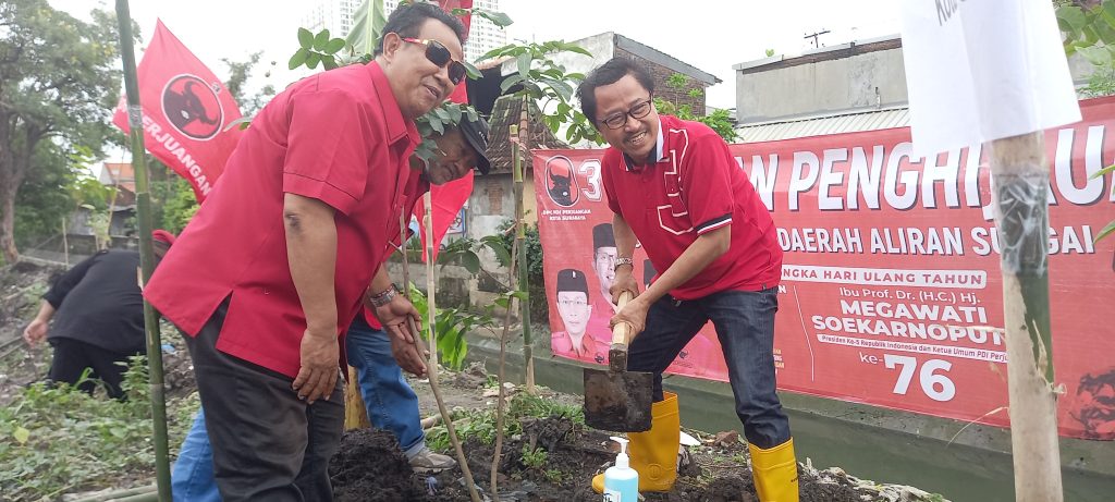 “termasuk salah satunya melakukan penghijauan yang harus dilakukan seluruh kader partai kebetulan pada tanggal 23/01/2023 kemarin HUT ketua umum PDI-Perjuangan Ibu Hj Megawati ke-76.” Ujar Sukadar sesuai penanaman pohon di bantaran sungai simomulyo, Sabtu, 28/01/2023.