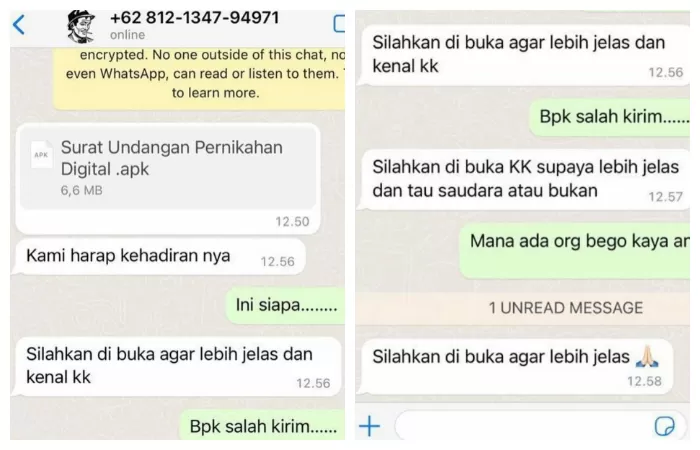 Dalam unggahan berisi tangkapan layar, tampak pelaku penipuan mengirimkan file melalui WhatsApp dengan format APK dengan nama surat undangan pernikahan. Kemudian pelaku mengirimkan pesan instan “Kami harap kehadiranya nya” menyusul di bawahnya.