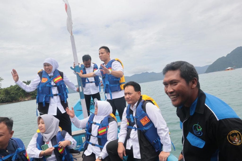 Didampingi oleh Bupati Trenggalek Nur Arifin, gubernur yang akrab disapa Khofifah itu menikmati ekowisata bahari dengan menaiki kapal bersama Cak Ipin.