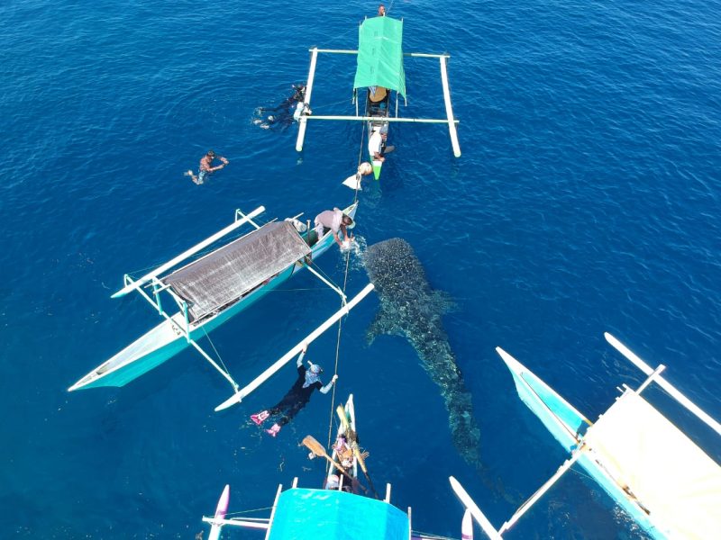 Foto udara sejumlah wisatawan mengunjungi objek wisata Hiu Paus di Desa Botubarani, Kabupaten Bone Bolango, Gorontalo, Rabu (8/3/2023).