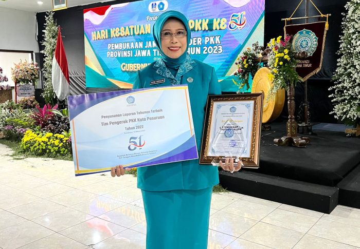 Pasuruan Kota Madinah. Nawacita – Tim Penggerak PKK Kota Pasuruan raih penghargaan yang di serahkan langsung oleh Gubernur Jawa Timur sebagai peringkat ke dua dalam Penyusunan Laporan Tahunan Terbaik Tahun 2022. Penghargaan ini diterima oleh Ketua TP PKK Kota Pasuruan Dra. Hj. Fatma Saifullah Yusuf di Multifuncition Room Hotel Grand Whiz Trawas Mojokerto, Selasa (14/03/2023).