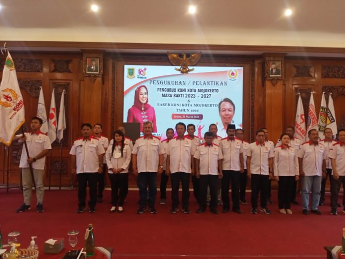 Mojokerto, Nawacita – Ketua umum Pengurus Komite Olahraga Nasional Indonesia (KONI) Jawa Timur secara resmi melantik Pengurus KONI Kota Mojokerto dalam masa bakti 2023-2027 di Pendopo Sabda Mandala Pemkot Mojokerto, Selasa (21/3/2023).