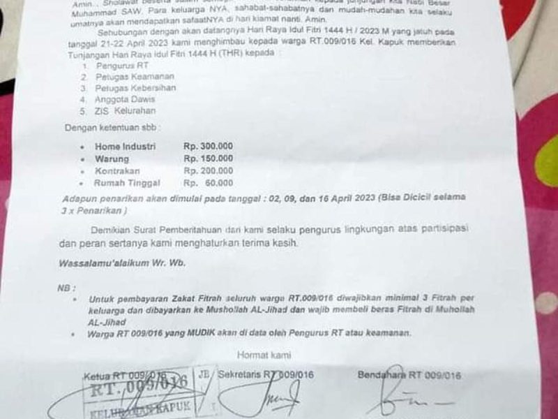 Adapun penarikan iuran untuk THR tersebut dimulai pada 2, 9, dan 16 April 2023. Mereka yang diminta membayar iuran bisa dicicil sebanyak tiga kali penarikan. “Demikian surat pemberitahuan dari kami selaku pengurus lingkungan atas partisipasi dan peran sertanya kami menghaturkan terima kasih,” demikian surat yang dibuat pengurus RT 009, RW 016 Kelurahan Kapuk, Kecamatn Cengkareng, Jakarta Barat tersebut.