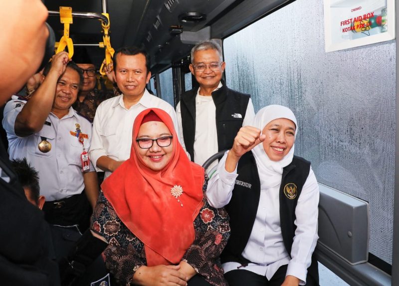 Gubernur Jatim Khofifah saat mencoba armada baru bus Trans Jatim koridor I yang pembayarannya bisa menggunakan QRIS Bank Jatim.