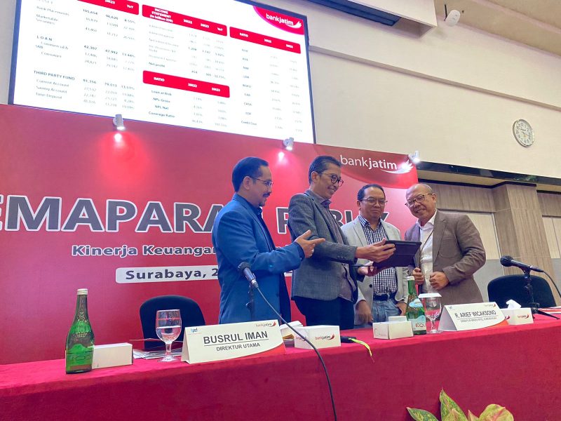 Corporate Secretary Bank Jatim Budi Sumarsono, Direktur Utama Bank Jatim Busrul Iman, Direktur Keuangan, Treasury dan Global Services Bank Jatim Edi Masrianto dan Direktur Mikro, Ritel, dan Menengah Bank Jatim, Arief Wicaksono usai menggelar Paparan Publik BJTM di Surabaya (28/4/2023)