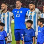 Jan Ethes Srinarendra jadi salah satu player escort timnas Argentina di laga persahabatan Indonesia versus Argentina di Stadion Utama Gelora Bung Karno Jakarta (19/6/2023).
