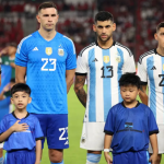 Jan Ethes Srinarendra jadi salah satu player escort timnas Argentina di laga persahabatan Indonesia versus Argentina di Stadion Utama Gelora Bung Karno Jakarta (19/6/2023).