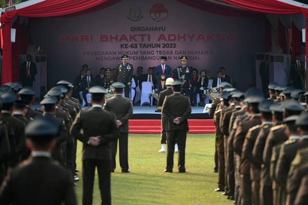 JAKARTA, Nawacita – Presiden Jokowi Hadiri Upacara Peringatan Hari Bhakti Adhyaksa ke-63 Tahun 2023 yang digelar di Lapangan Upacara Badan Pendidikan dan Pelatihan Kejaksaan Republik Indonesia, Jakarta, pada Sabtu, 22 Juli 2023. Dalam amanatnya, Kepala Negara menyampaikan ucapan selamat kepada seluruh keluarga besar Kejaksaan Republik Indonesia.
