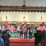 Sekjen DPP PDIP Hasto Kristiyanto (tengah) saat memberikan sambutan dalam pagelaran Wayang Kulit Dalang 3 di Halaman Masjid At-Taufiq, di depan Sekolah Partai Lenteng Agung, Jakarta (28/7/2023).