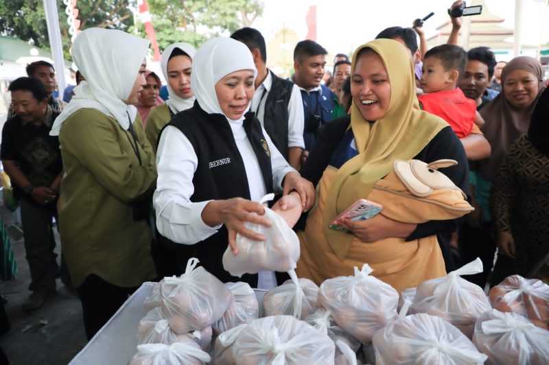 Gubernur Jawa Timur, Khofifah Indar Parawansa kembali meninjau secara langsung operasi pasar murah dalam rangkaian Hari Jadi ke-78 Provinsi Jatim yang digelar di depan Pendopo Kabupaten Jombang (17/9/2023).