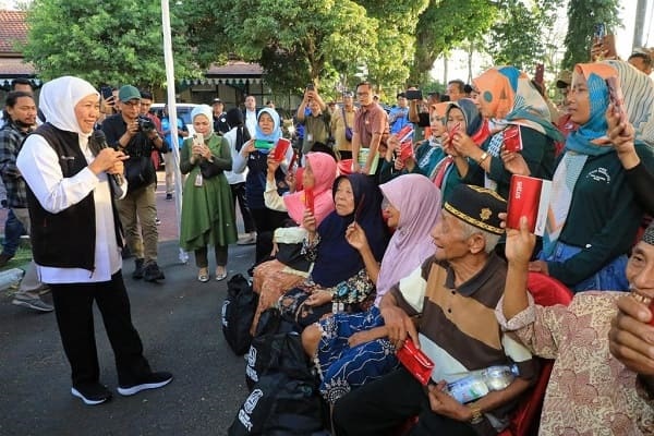 Tak hanya menyerahkan bantuan, Gubernur Khofifah juga menyapa para penerima manfaat dengan hangat. Ia, juga meminta para penerima mengangkat buku tabungan Bank Jatim yang diterima.