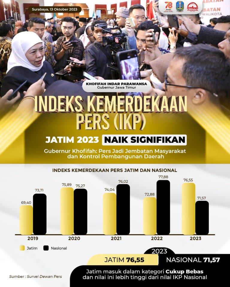 Dibanding tahun 2022, IKP 2023 naik 3,67 poin dan menjadi angka IKP Jatim yang tertinggi dalam lima tahun terakhir. Dengan angka ini, menempatkan Jatim masuk dalam kategori cukup bebas dan nilai ini lebih tinggi dari nilai IKP nasional yaitu 71,75.