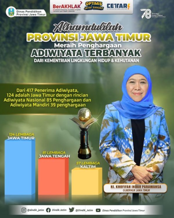 Jumlah satuan pendidikan Jatim yang menerima penghargaan Adiwiyata Tahun 2023 ini merupakan yang terbanyak Se-Indonesia.