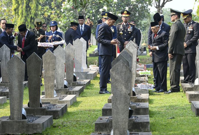 Jakarta, Nawacita | Presiden Joko Widodo (Jokowi) dan Wakil Presiden Ma’ruf Amin tabur bunga ke sejumlah makam pahlawan di TMP Kalibata usai memimpin upacara ziarah nasional dalam rangka Hari Pahlawan di TMP Kalibata, Jakarta Selatan.