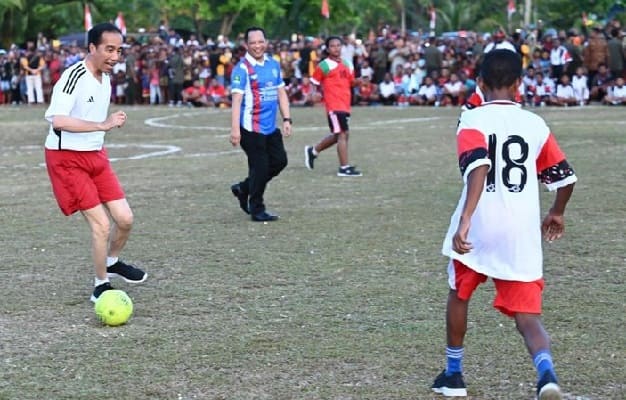 Presiden Jokowi Main Sepak Bola dengan Pelajar Biak Numfor di Lapangan Sorido