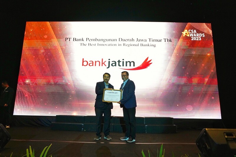 Jakarta, Nawacita | PT Bank Pembangunan Daerah Jawa Timur Tbk (bank Jatim) berhasil meraih penghargaan CSA Awards 2023 untuk kategori The Best Innovation in Regional Banking. Bertempat di Menara 165 Granada Ballroom Jakarta, penghargaan diterima oleh Corporate Secretary bank Jatim Wioga Adhiarma Aji pada hari Kamis (23/11/2023).