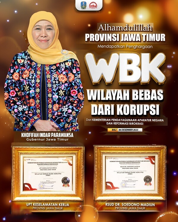 Dua instansi tersebut adalah RSUD Dr Soedono Madiun dan UPT Keselamatan Kerja, Dinas Tenaga Kerja dan Transmigrasi Provinsi Jatim. Dimana Predikat WBK ini diraih setelah melalui proses penilaian ketat berdasarkan kualitas pelayanan yang baik dan berintegritas.