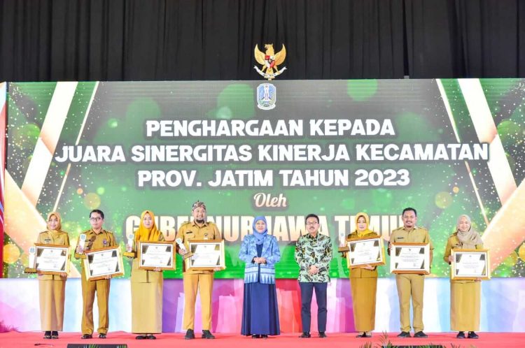 Surabaya, Nawacita | Gubernur Jawa Timur Khofifah Indar Parawansa memberikan penghargaan kepada 7 camat berprestasi di Bumi Majapahit yang terpilih menjadi Juara Sinergitas Kinerja Kecamatan (SKK) dalam gelaran Rapat Pembinaan Kecamatan Provinsi Jawa Timur tahun 2023, di Dyandra Convention Center, Selasa (12/12/2023).