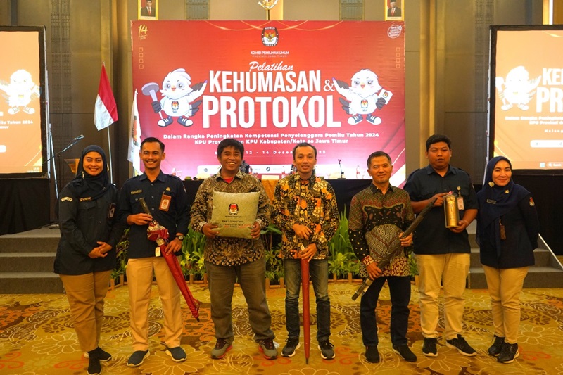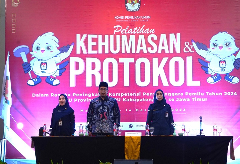Kota Malang. Nawacita – KPU Jatim menggelar Pelatihan Kehumasan dan Protokol pada 12 Desember 2023. Rangkaian pembukaan dimulai pukul 14.00. Perwakilan dari KPU Jatim dan KPU Kabupaten/Kota hadir sebagai peserta dalam rangkaian pembukaan yang dimulai pukul 14. Dalam acara ini, KPU Jatim dan KPU Kabupaten/Kota dihadiri oleh perwakilan sekretariat yang terdiri dari Divisi Sosdiklih, Parmas, dan SDM