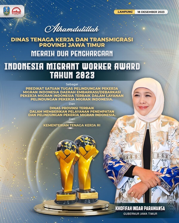 Penghargaan pertama, yaitu sebagai Provinsi Terbaik dalam memberikan pelayanan penempatan dan perlindungan Pekerja Migran Indonesia (PMI). Ini merupakan penghargaan kelima kali berturut-turut diraih oleh Pemprov Jatim sejak dilaksanakan IMWA tahun 2019-2023.