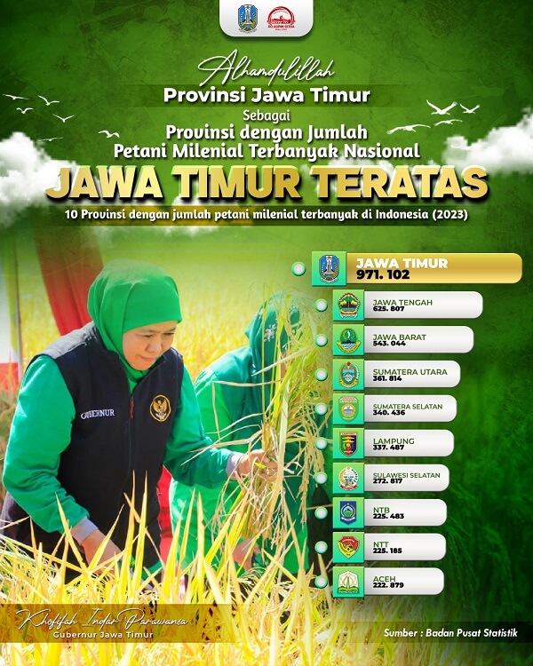 Gubernur Khofifah mengungkapkan, jumlah petani milenial ini juga menunjang posisi Jatim yang merupakan lumbung pangan nasional untuk _support_ 16 provinsi di wilayah Indonesia Timur. Yang mana, selama 4 tahun berturut-turut sejak 2020 sampai dengan 2023 Jatim merupakan produsen Padi tertinggi di antara seluruh provinsi di Indonesia.
