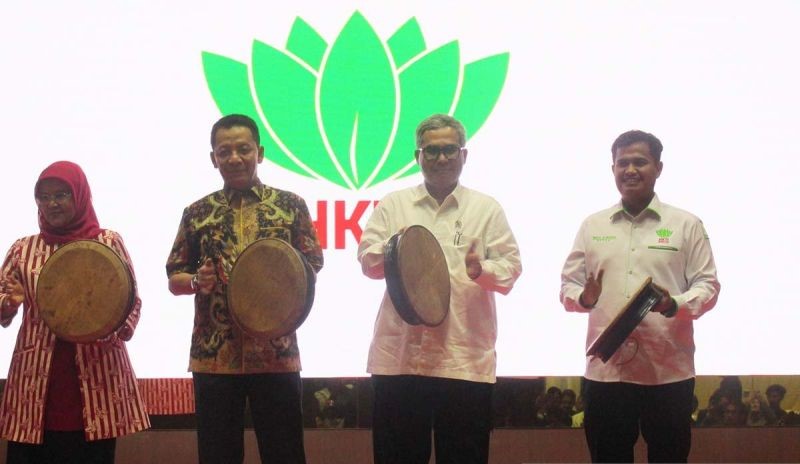 Wamentan RI Harvick Hasnul Qolbi (dua dari kanan) memukul rapai tanda peluncuran program 1.000 kelompok petani milenial di Banda Aceh.