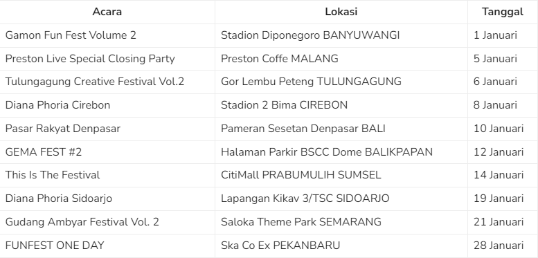 Kabar baik untuk kamu para pencinta lagu-lagu Jawa. bakal tampil di 10 tempat berbeda pada bulan Januari 2024. Mereka akan hadir di berbagai festival dan konser musik spektakuler.