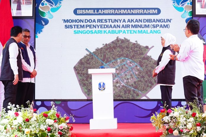 Peluncuran pembangunan SPAM Singosari Malang ditandai dengan penekanan tombol sirine oleh Gubernur Khofifah didampingi Pj Sekda Kabupaten Malang Nurman Ramdansyah, dan Kepala Dinas Perumahan Rakyat, Kawasan Pemukiman dan Cipta Karya Provinsi Jatim, I Nyoman Gunadi.
