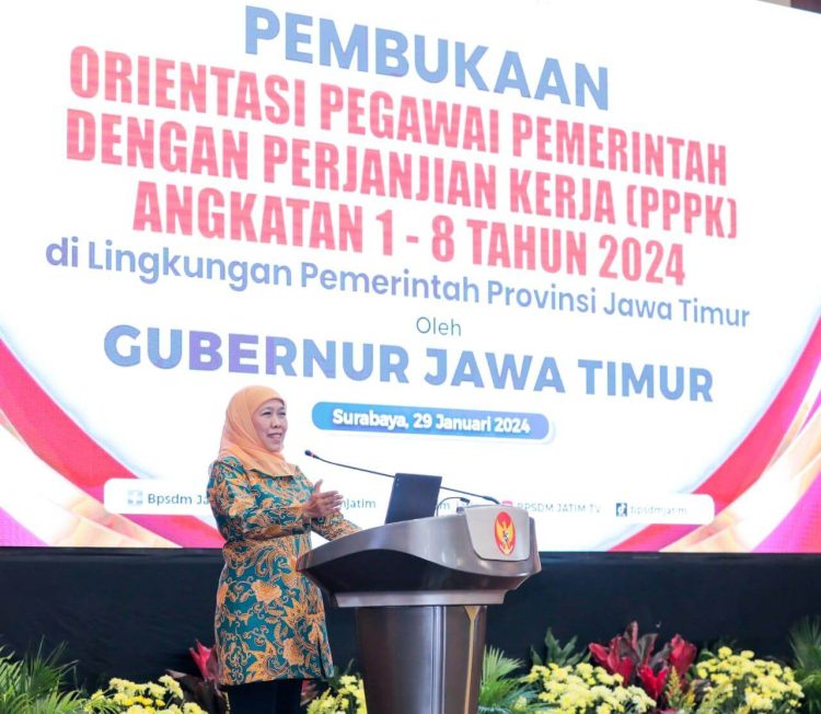 Surabaya, Nawacita | Gubernur Jatim Khofifah Indar Parawansa membuka orientasi Pegawai Pemerintah dengan Perjanjian Kerja (PPPK) Pemprov Jatim Tahun 2024 di Aula Sasana Wiyata Praja, BPSDM Provinsi Jatim, Senin (29/1/2024).