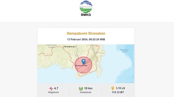 BMKG: Getaran Gempa M 4,7 di Kalsel Terasa Sampai Kalteng