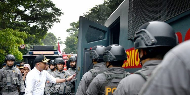 Pj Gubernur Jabar Bey Machmudin melepas 19.750 personel gabungan dalam apel pergeseran pasukan dan patroli gabungan terpadu dalam rangka pengamanan Pemilu 2024 di wilayah Jabar, di depan Gedung Sate, Kota Bandung (12/2/2024).