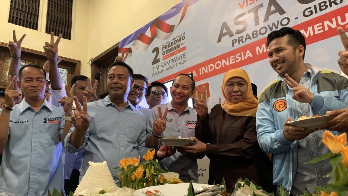 Di sebelahnya, dua buah tumpeng. Khofifah yang didampingi Jubir TKN Emil Elestianto Dardak, terlihat berdoa. Membaca Fatikah, diamini semua relawan.