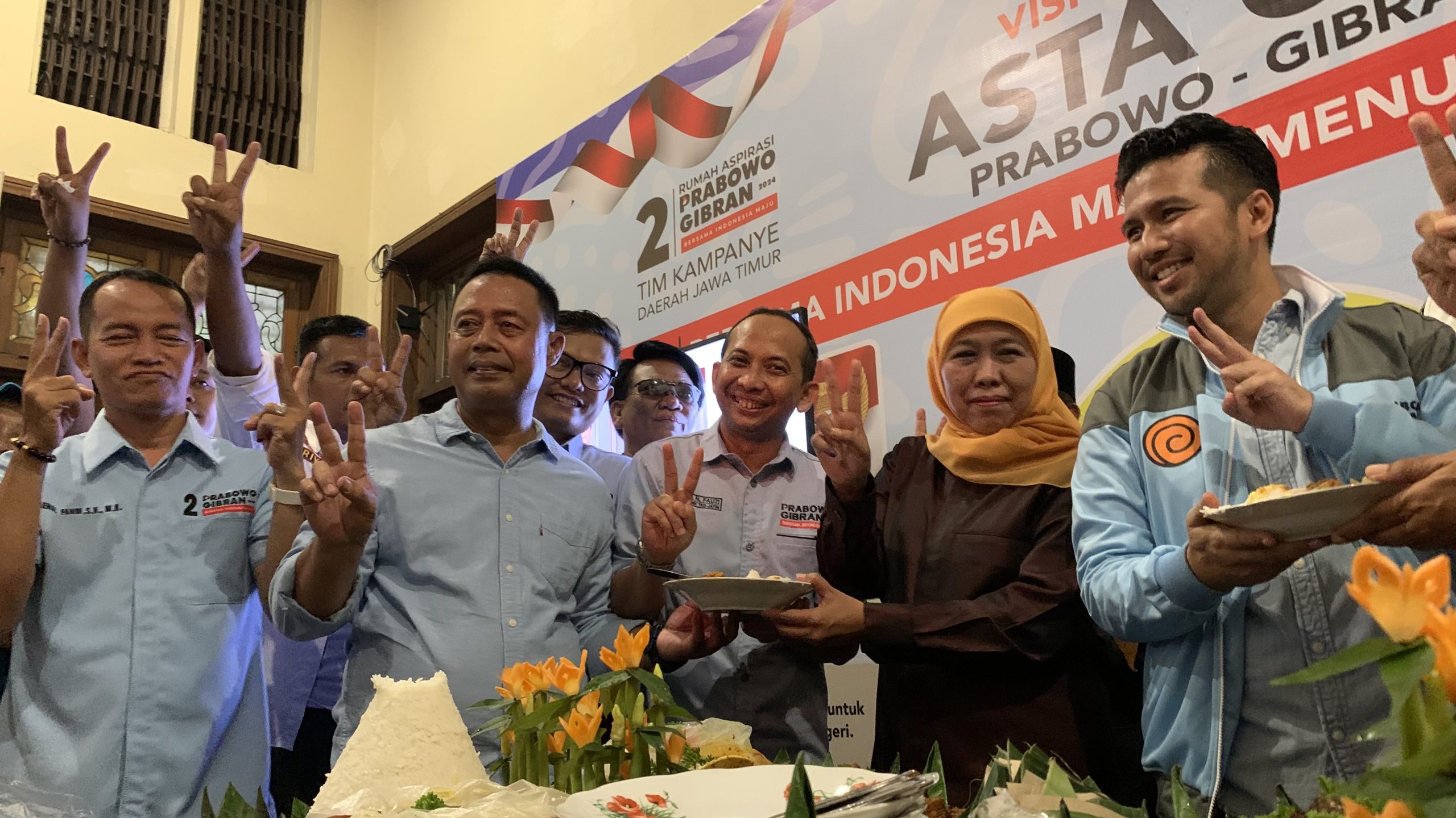 Tampak hadir menerima potongan tumpeng dari Khofifah, yakni Emil Elestianto Dardak, Boedi Prijo Suprayitno, Helmy, jajaran ketua Parpol pengusung Pragib, HM Arum Sabil, dan sejumlah tokoh lainnya.