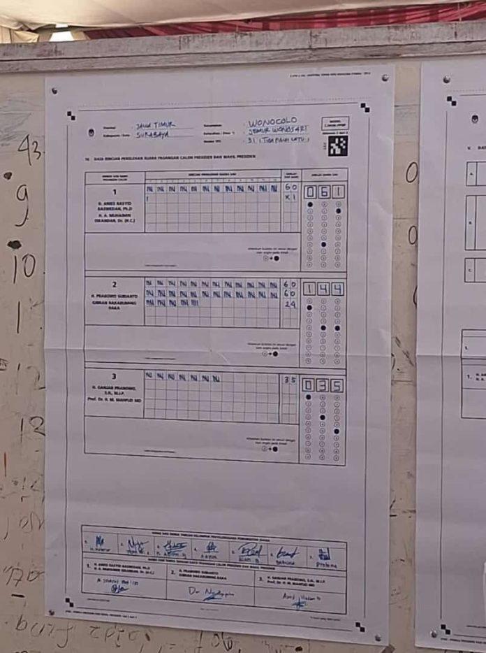 Surabaya, Nawacita – Paslon 02 Prabowo Subianto-Gibran Rakabuming Raka menang telak di TPS 31 Jalan Jemursari, Kelurahan Jemurwonosari, Kecamatan Wonocolo, Surabaya. TPS ini merupakan tempat memilih Khofifah Indar Parawansa beserta tiga putranya.