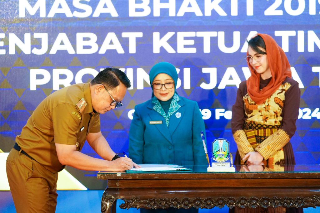 Kemudian dilanjutkan dengan Sertijab penjabat Ketua Tim Penggerak (TP PKK) Provinsi Jatim Isye Sri Rahayu Adhy Karyono dari Ketua TP PKK Jatim Periode 2019-2024 Arumi Bachsin Emil Dardak.