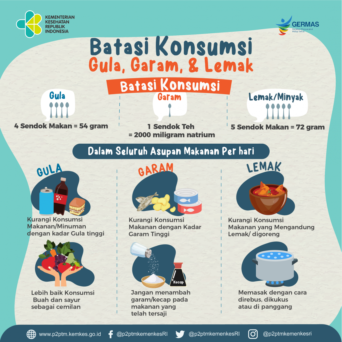 Sedangkan untuk garam batasnya adalah 2000 miligram natrium/sodium atau 5 gram garam (1 sendok teh), dan untuk lemak hanya 67 gram (5 sendok makan minyak). dtk